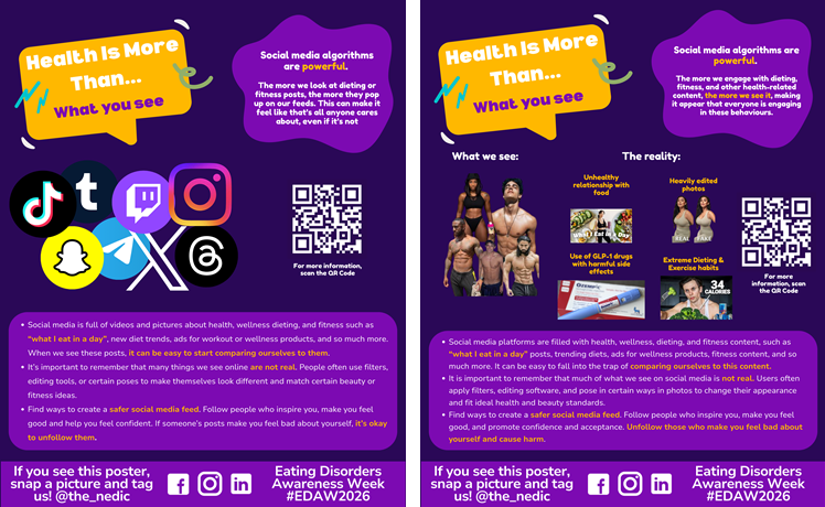 Social media can make it seem like health has a single look or can be achieved by a single diet or fitness regimen. When in reality, health looks different for every person and cannot be captured by a single image or trend. This poster invites reflection on the diverse, real-life experiences of health, beyond curated online content.