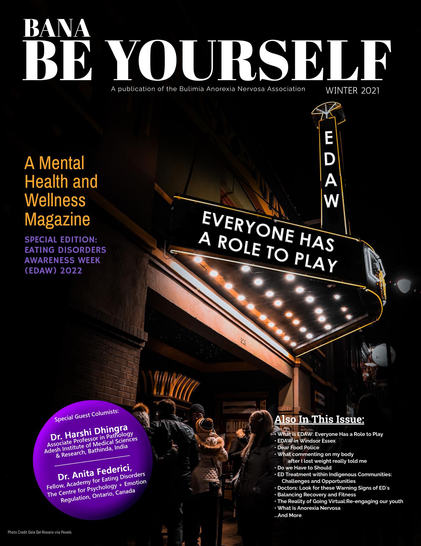 Interested in the history of Eating Disorders Awareness Week? Want to read more about this year's message of "Everyone has a role to play" in detail? The BANA Magazine serves as a vehicle for clinicians, educators, and those across the mental health field nationally and internationally to learn about our community conversations in Canadian eating disorders and hear a variety of perspectives regarding awareness, wellness, and support. Visit the link below and share this free publication with those around you!