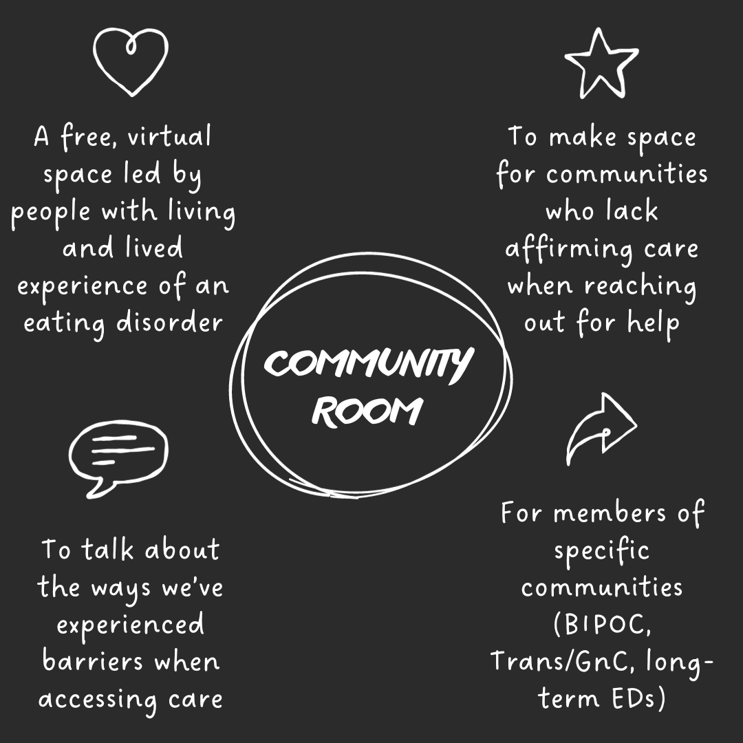 In these two-hour community rooms, people with living and lived experience with an eating disorder will work together collectively to map their journey towards accessing “help”, connect with others across the country who might have similar experiences, and affirm that they are not “too complex”, “too much”, or have “failed treatment”.