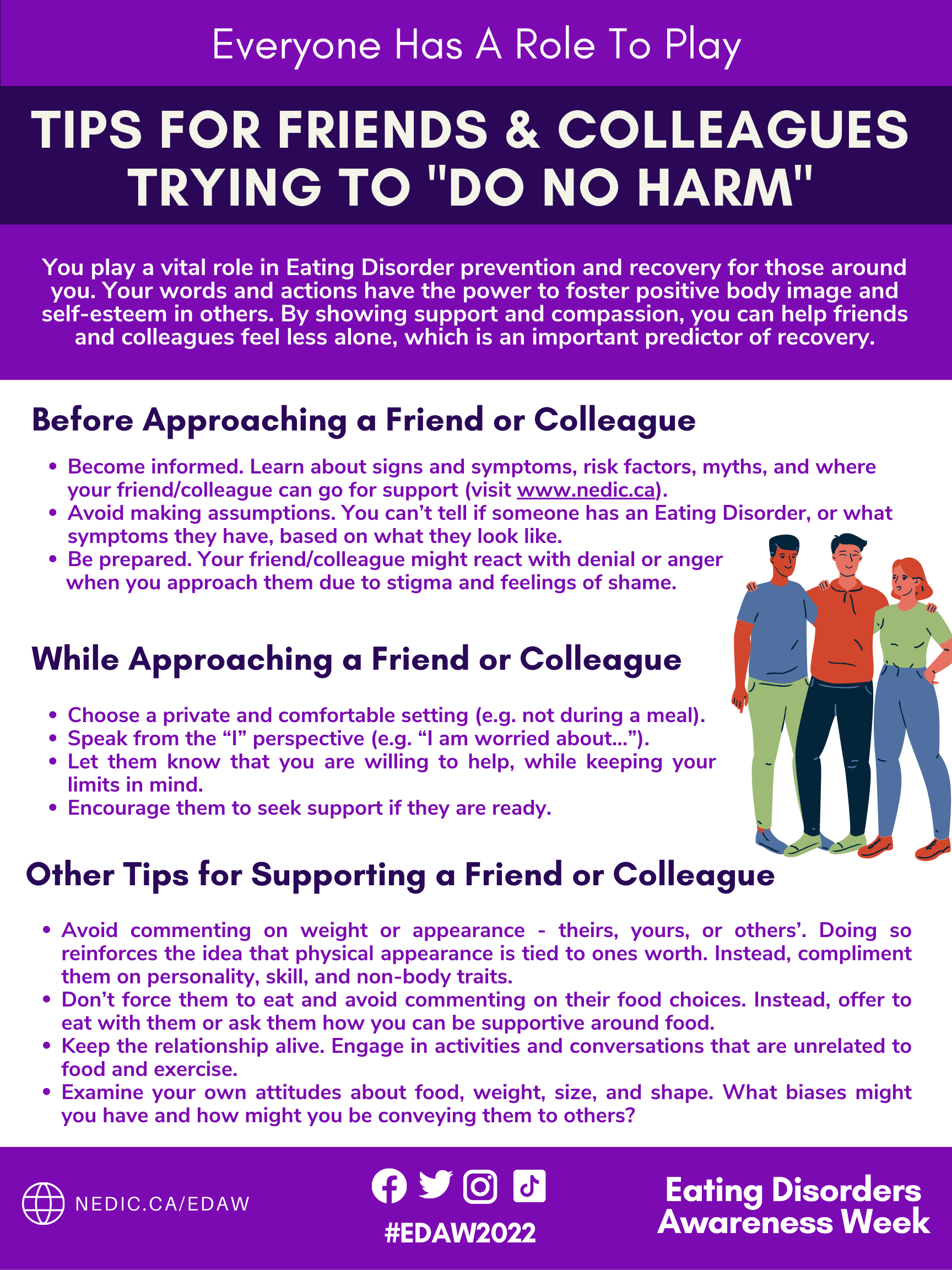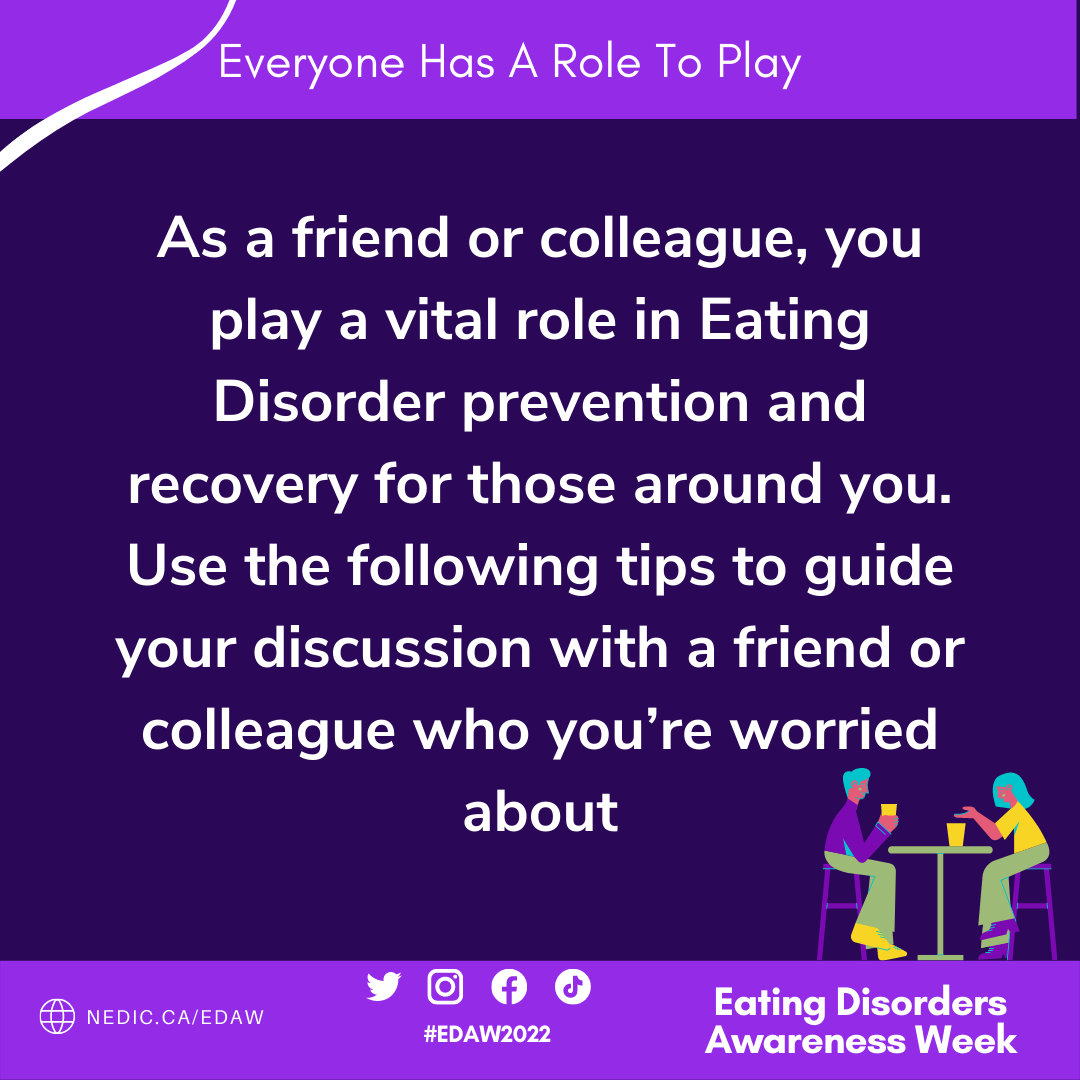 Save on your phone, take a screenshot and text to a friend, or print it to pin up around you. This handy poster shares some introductory tips for you to keep in mind as you look to support a friend or colleague who might be experiencing disordered eating.