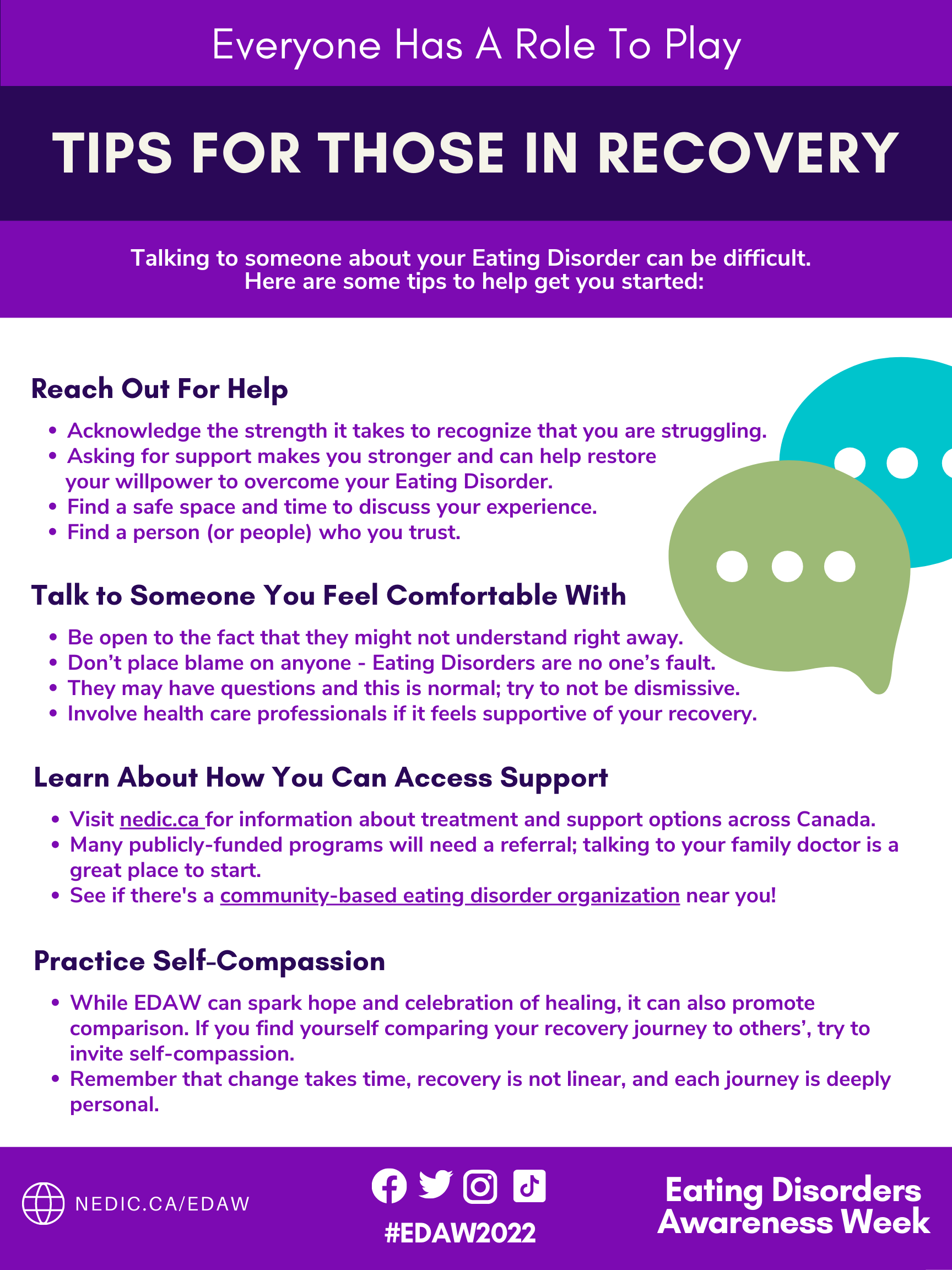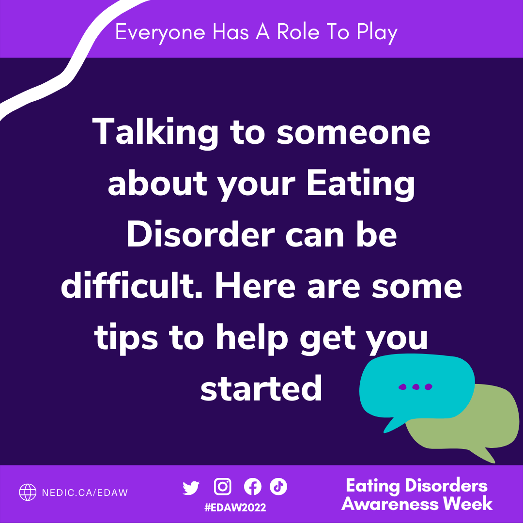 Designed for use on social media platforms, this set of five images features a title slide and four tips for people to keep in mind as they think about talking to someone about their experience with an Eating Disorder or disordered eating.