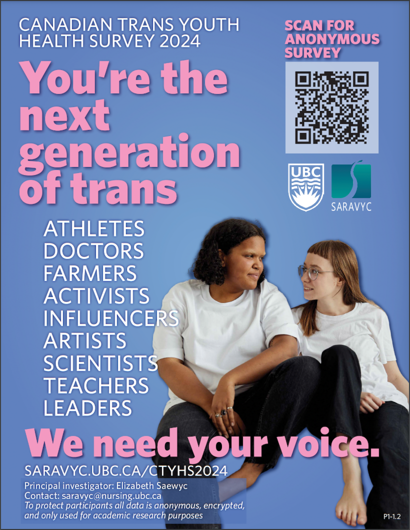 Researchers from around Canada, led by Principal Investigator Elizabeth Saewyc at the University of British Columbia (UBC), are seeking participants for a survey to learn more about health issues facing trans youth. Results of this survey will be used to improve trans youth health services and programs throughout Canada.