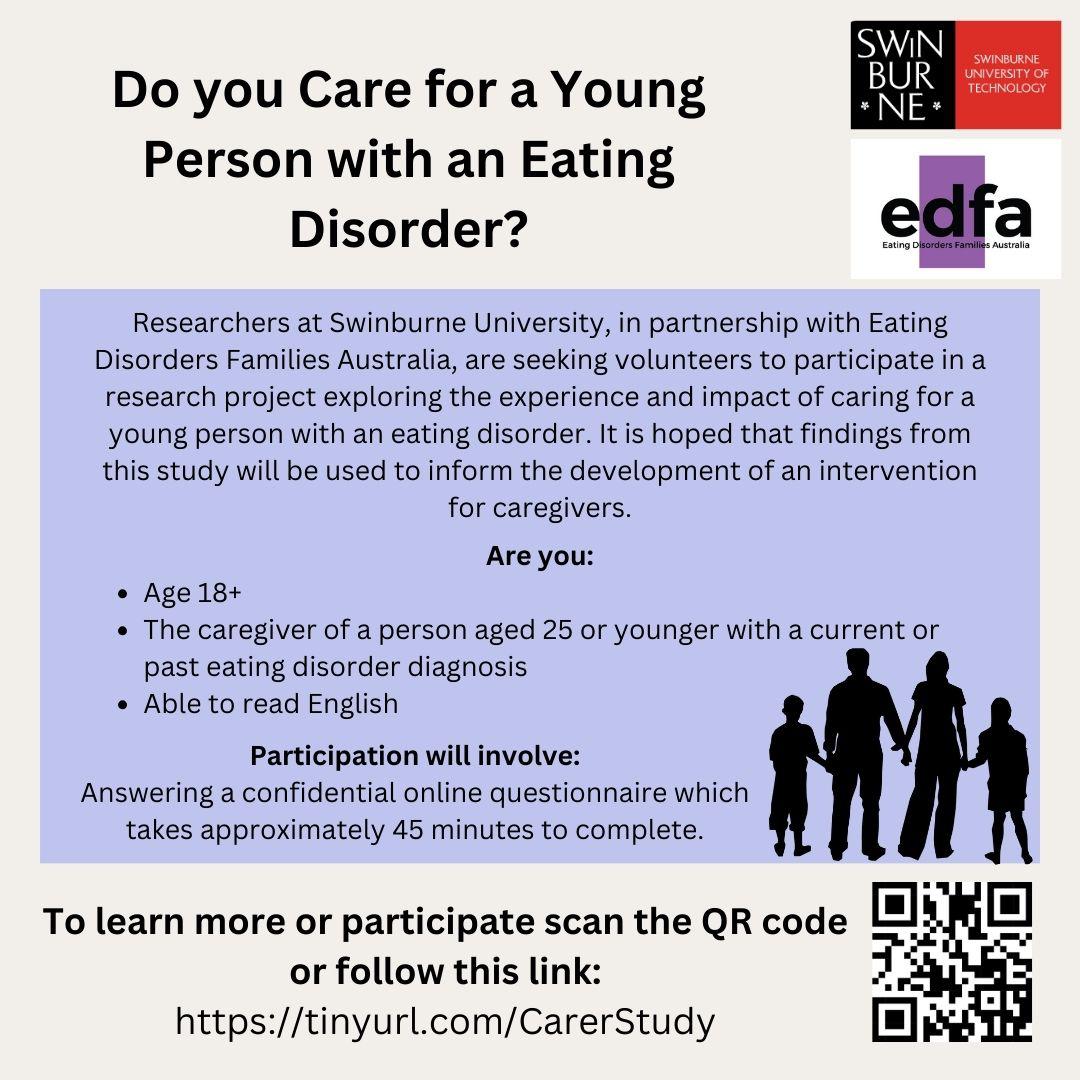 Researchers at Swinburne University, in partnership with Eating Disorders Families Australia, are seeking participants for a research project exploring the experience and impact of caring for a young person with an eating disorder. It is hoped that findings from this study will be used to inform the development of an intervention for caregivers.