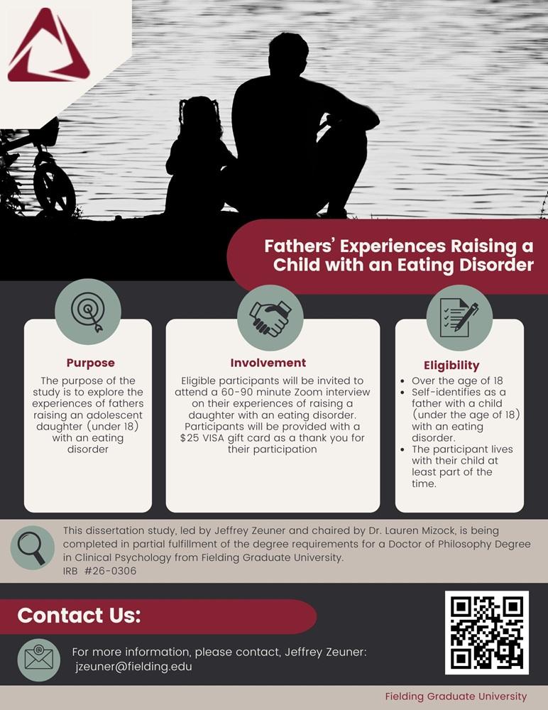 Jeffrey Zeuner, a PhD student in Clinical Psychology at Fielding Graduate University, is seeking participants for their dissertation examining the experiences of fathers with a child with an eating disorder.