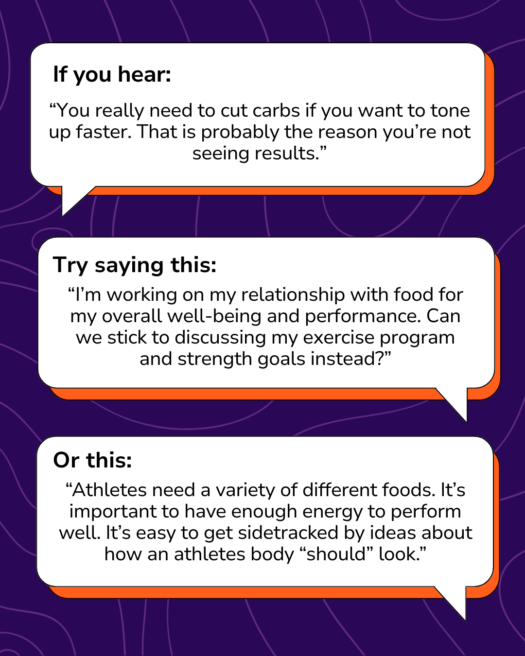This sets of five images contain a title slide and four graphics offering conversation strategies that interrupt unsafe conversations about food, bodies and exercise in physical activity spaces, like the gym, in a class, on a sports team, or with a coach or personal trainer.