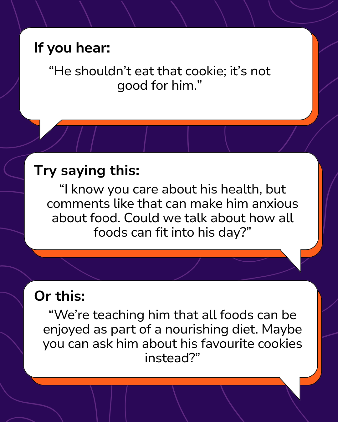 These sets of five images contain a title slide and four graphics offering conversation strategies that interrupt unsafe conversations about food, bodies and exercise at home - ready for parents and caregivers to use to support conversations with each other, family members, and other adults around their children.