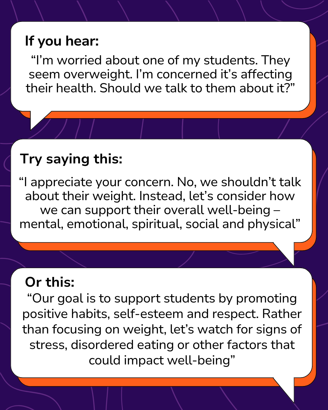 This sets of five images contain a title slide and four graphics offering conversation strategies that interrupt unsafe conversations about food, bodies and exercise at school - ready for use by teachers, lunch supervisors, educational assistants, school support staff, and school administration!