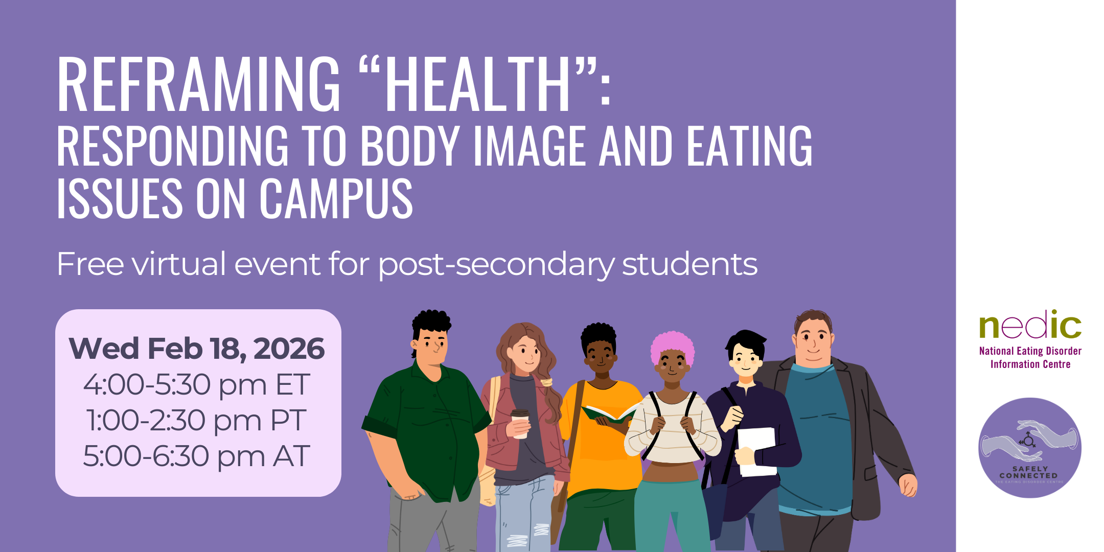 Join NEDIC and Safely Connected, The Eating Disorder Centre for this interactive workshop that will address body image, eating, and mental health in post-secondary settings.